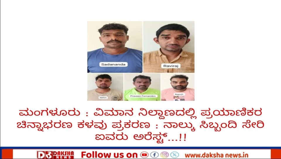 ಬಂಧಿತ ಆರೋಪಿಗಳನ್ನು ಏರ್ ಇಂಡಿಯಾ ಎಕ್ಸ್ ಪ್ರೆಸ್ ನ ಲೋಡಿಂಗ್ – ಅನ್ ಲೋಡಿಂಗ್ ಮಾಡುವ ಸಾಟ್ಸ್ ನೌಕರರಾದ ನಿತಿನ್, ಮೂಡುಪೆರಾರದ ನಿವಾಸಿಗಳಾದ ಸದಾನಂದ, ರಾಜೇಶ್, ಬಜ್ಪೆ ನಿವಾಸಿ ಪ್ರವೀಣ್ ಫೆರ್ನಾಂಡಿಸ್ ಮತ್ತು ಚಿನ್ನಾಭರಣ ಪಡೆದುಕೊಂಡು ಚಿನ್ನದ ಗಟ್ಟಿಯಾಗಿಸಿದ್ದ ಬಜ್ಪೆ ಮೂಡುಪೆರಾರ ನಿವಾಸಿ ರವಿರಾಜ್ ಎಂದು ಪೊಲೀಸರು ಮಾಹಿತಿ ನೀಡಿದ್ದಾರೆ.