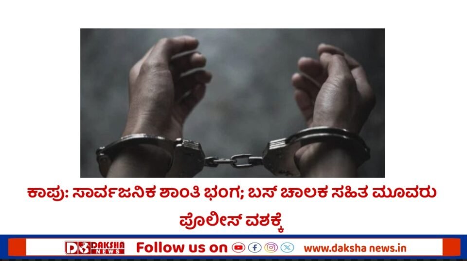 ಕಾಪು: ಕಾಪು ಪೇಟೆಯಲ್ಲಿ ಸಾರ್ವಜನಿಕ ಶಾಂತಿ ಭಂಗ ಮಾಡಿದ ಆರೋಪದಲ್ಲಿ ಖಾಸಗಿ ಬಸ್ ಚಾಲಕ ಸಹಿತ ಮೂವರ ವಿರುದ್ಧ ಪೊಲೀಸರು ಪ್ರಕರಣ ದಾಖಲಿಸಿ ವಶಕ್ಕೆ ಪಡೆದುಕೊಂಡಿದ್ದಾರೆ.