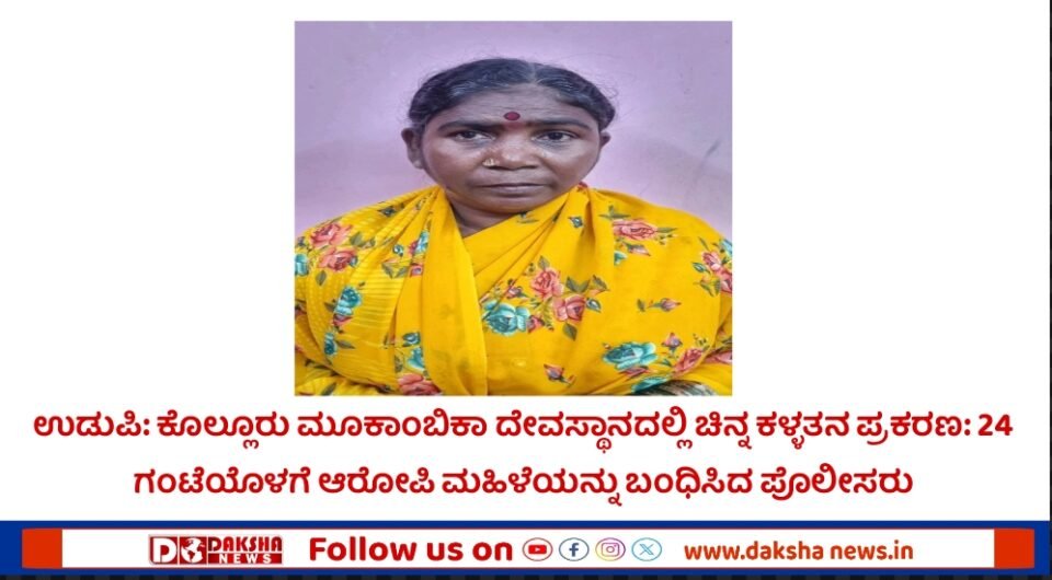 ಉಡುಪಿ: ಕೊಲ್ಲೂರು ಮೂಕಾಂಬಿಕಾ ದೇವಸ್ಥಾನದಲ್ಲಿ ಚಿನ್ನ ಕಳ್ಳತನ ಪ್ರಕರಣಕ್ಕೆ ಸಂಬಂಧಪಟ್ಟಂತೆ 24 ಗಂಟೆಯೊಳಗೆ ಆರೋಪಿ ಮಹಿಳೆಯನ್ನು ಪೊಲೀಸರು ಬಂಧಿಸಿದ್ದಾರೆ.