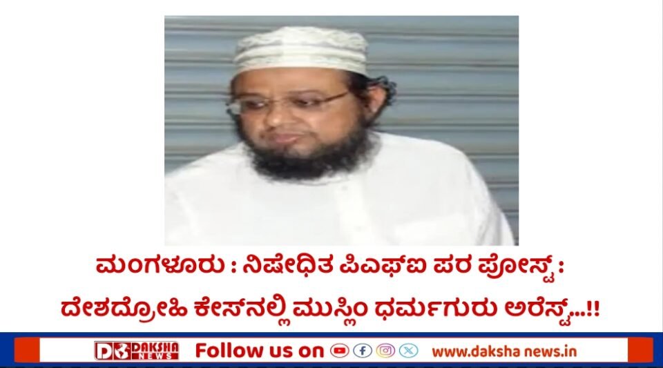 ಮಂಗಳೂರು: ನಿಷೇಧಿತ ಸಂಘಟನೆ ಪಿಎಫ್ಐ ಪರವಾಗಿ ಜಾಲತಾಣದಲ್ಲಿ ಪೋಸ್ಟ್ ಹಾಕಿದ್ದಲ್ಲದೆ, ಸಂಘಟನೆಯನ್ನು ಬಲಪಡಿಸುವ ಉದ್ದೇಶದಿಂದ ಪ್ರಚಾರ ಮಾಡುತ್ತಿದ್ದ ಉಪ್ಪಿನಂಗಡಿ ಮೂಲದ ಮುಸ್ಲಿಂ ಧರ್ಮಗುರು ಸೈಯದ್ ಇಬ್ರಾಹಿಂ ತಂಙಳ್ ಎಂಬುವರನ್ನು ಮಂಗಳೂರು ಪೊಲೀಸರು ಬಂಧಿಸಿದ್ದಾರೆ.