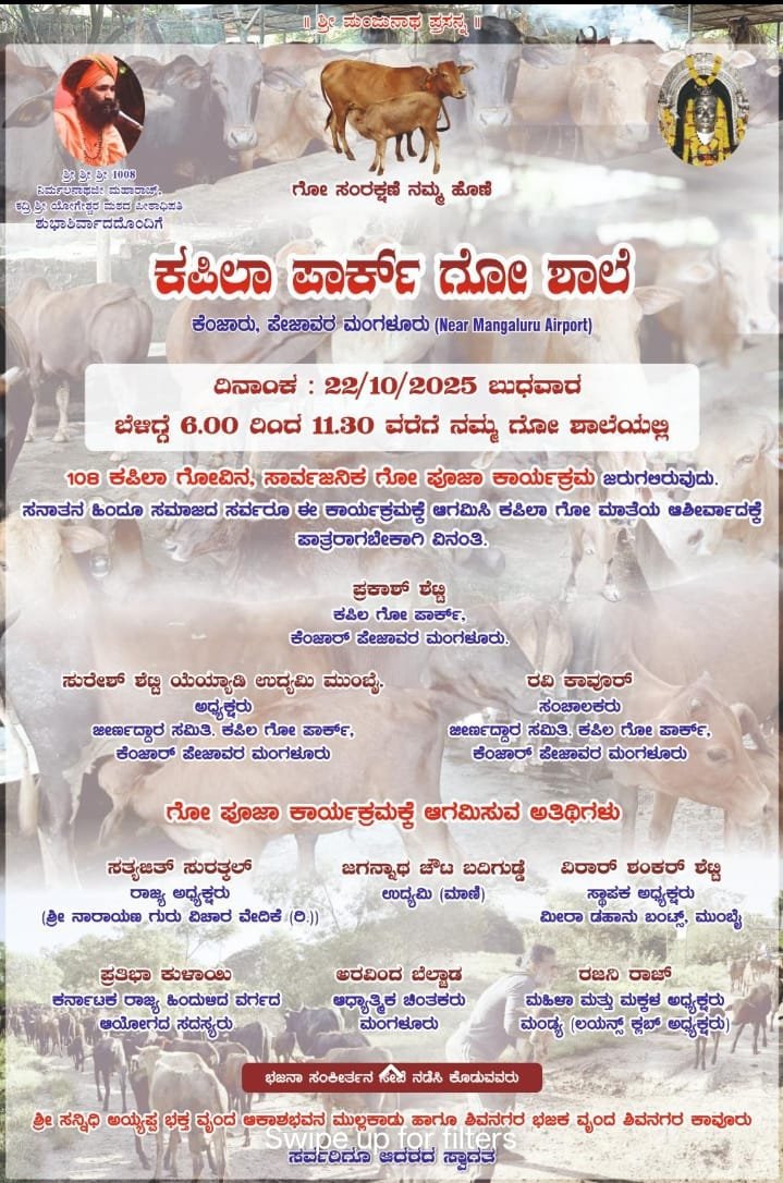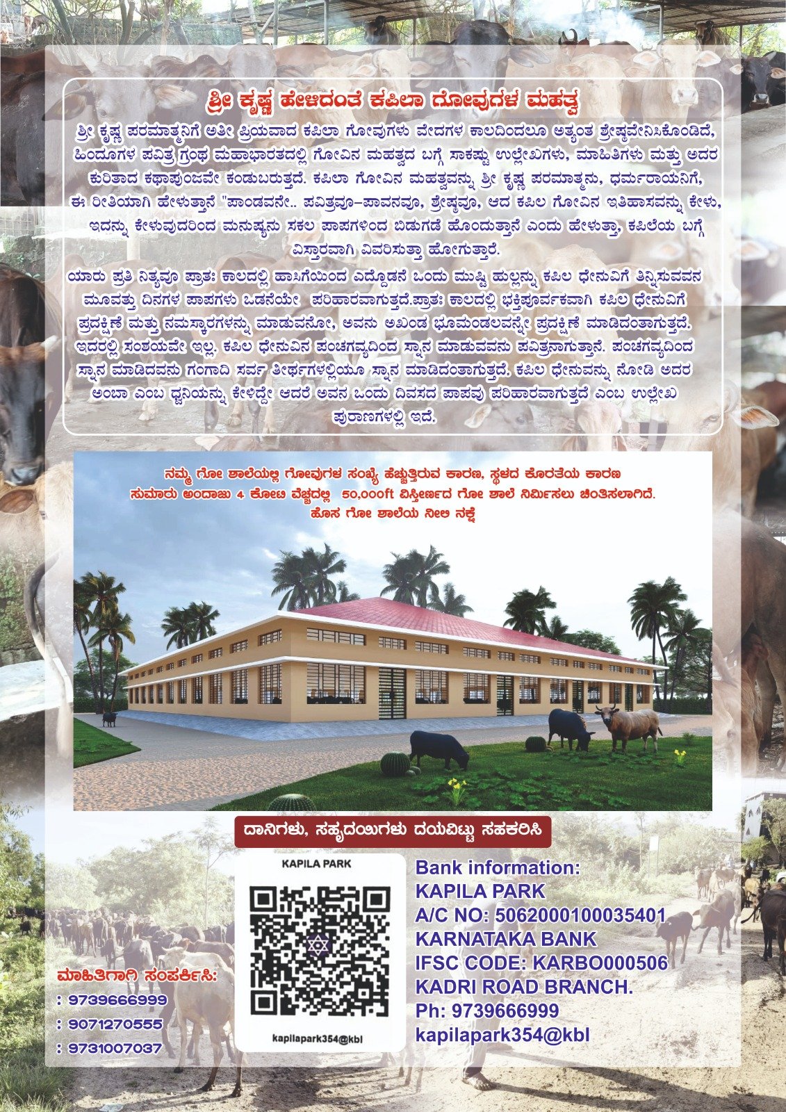 ಪ್ರಕೃತಿ ಮತ್ತು ಪಶು ಸಂರಕ್ಷಣೆಯ ಮಹತ್ವ ಸಾರುವ ಮತ್ತು ಗೋವಿನ ಪಾವಿತ್ರ್ಯವನ್ನು ಎತ್ತಿ ಹಿಡಿಯುವ ಉದ್ದೇಶದಿಂದ ಕಪಿಲಾ ಪಾರ್ಕ್ ಗೋ ಶಾಲೆ, ಕೆಂಜಾರು, ಮರವೂರ್ ನಲ್ಲಿ ವಿಶೇಷ ಕಾರ್ಯಕ್ರಮವನ್ನು ಆಯೋಜಿಸಲಾಗಿದೆ. ಈ ಹಿನ್ನೆಲೆಯಲ್ಲಿ, ಕಾರ್ಯಕ್ರಮದ ಪೂರ್ವಭಾವಿ ಮಾಹಿತಿ ನೀಡಲು ಪತ್ರಿಕಾಗೋಷ್ಠಿಯನ್ನು ಕರೆಯಲಾಗಿದೆ.