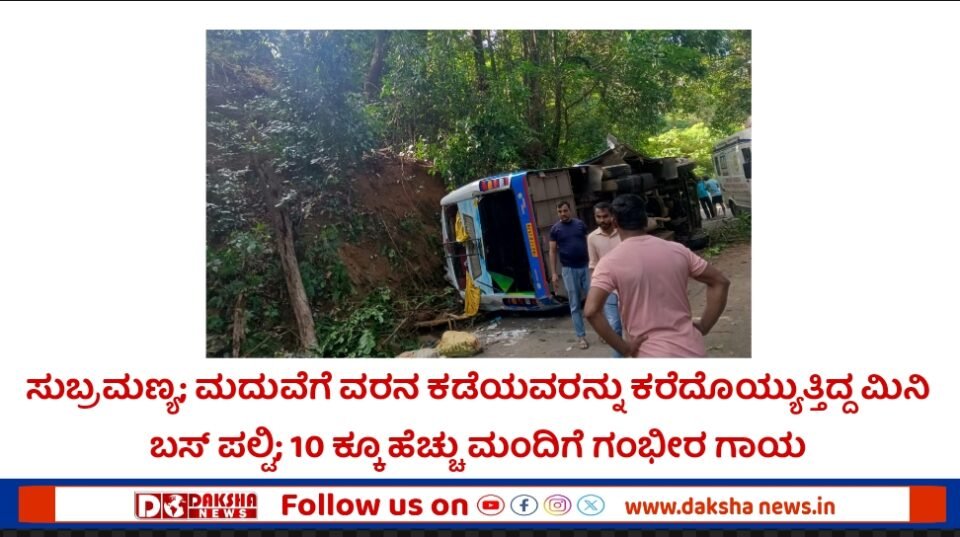 ಸುಬ್ರಮಣ್ಯ; ಮದುವೆಗೆ ವರನ ಕಡೆಯವರನ್ನು ಕರೆದೊಯ್ಯುತ್ತಿದ್ದ ಮಿನಿ ಬಸ್ ಪಲ್ಟಿಯಾಗಿ 10 ಕ್ಕೂ ಹೆಚ್ಚು ಮಂದಿಗೆ ಗಂಭೀರ ಗಾಯಗಳಾಗಿರುವ ಘಟನೆ ಹಾಸನ ಜಿಲ್ಲೆ ಸಕಲೇಶಪುರ ತಾಲೂಕಿನ ಬಿಸಲೆ ಘಾಟ್ ನಲ್ಲಿ ನಡೆದಿದೆ.