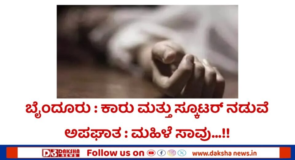 ಬೈಂದೂರು: ಉಡುಪಿ ಜಿಲ್ಲೆಯ ಬೈಂದೂರು ಸಮೀಪ ಕಾರು ಹಾಗೂ ಸ್ಕೂಟರ್ ನಡುವೆ ಅಪಘಾತದಲ್ಲಿ ಸಹ ಸವಾರೆ ಸಾವನ್ನಪ್ಪಿದ ಘಟನೆ ಸಂಭವಿಸಿದೆ.ಮೃತಪಟ್ಟ ಸಹ ಸವಾರೆ ತಸ್ಬೀಯಾ ಬೇಗಂ ಎಂದು ತಿಳಿದು ಬಂದಿದೆ.
