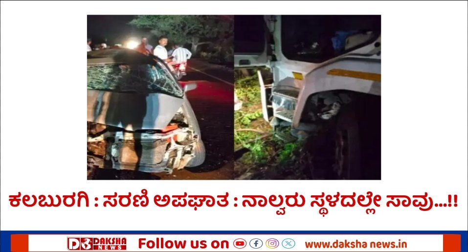 ಕಲಬುರಗಿ: ತಾಲ್ಲೂಕಿನ (ಬಿ) ಗ್ರಾಮದ ಬಳಿ ಶುಕ್ರವಾರ ರಾತ್ರಿ ನಡೆದ ಭೀಕರ ರಸ್ತೆ ಅಪಘಾತದಲ್ಲಿ ನಾಲ್ವರು ಸ್ಥಳದಲ್ಲೇ ಸಾವನ್ನಪ್ಪಿದ ಘಟನೆ ನಡೆದಿದೆ.ಡೀಸೆಲ್ ಟ್ಯಾಂಕರ್, ಬೈಕ್ ಹಾಗೂ ಕಾರಿನ ನಡುವೆ ಈ ಅಪಘಾತ ಸಂಭವಿಸಿದೆ. ಬೈಕ್ನಲ್ಲಿದ್ದ ಇಬ್ಬರು ಸವಾರರು ಹಾಗೂ ಕಾರಿನಲ್ಲಿದ್ದ ಇಬ್ಬರು ಸ್ಥಳದಲ್ಲೇ ಅಸುನೀಗಿದ್ದಾರೆ ಎಂದು ತಿಳಿಯಲಾಗಿದೆ.ಬೈಕ್ ಸವಾರರಾದ ಕಮಲಾಪುರ ತಾಲ್ಲೂಕಿನ ಸಿರಡೋಣ ಗ್ರಾಮದ ನಾಗೇಂದ್ರಪ್ಪ ಮೂಲಗೆ (35) ಹಾಗೂ ಶಿವಕುಮಾರ ಮೂಲಗೆ (27), ಬೀದರ್ ಜಿಲ್ಲೆಯ ಭಾಲ್ಕಿ ತಾಲ್ಲೂಕಿನ ಜೋಳದಾಪಕಾ ಗ್ರಾಮದ ನಿವಾಸಿ, ತಾಲ್ಲೂಕು ರೈತ ಸಂಘದ ಉಪಾಧ್ಯಕ್ಷ ದತ್ತಾ ನಾಗೇಂದ್ರ ಚಿಮ್ಮಾಜಿ (42) ಮತ್ತು ಚಂದ್ರಕಲಾ ನಾಗೇಂದ್ರ ಚಿಮ್ಮಾಜಿ (75) ಮೃತಪಟ್ಟಿದ್ದಾರೆ.