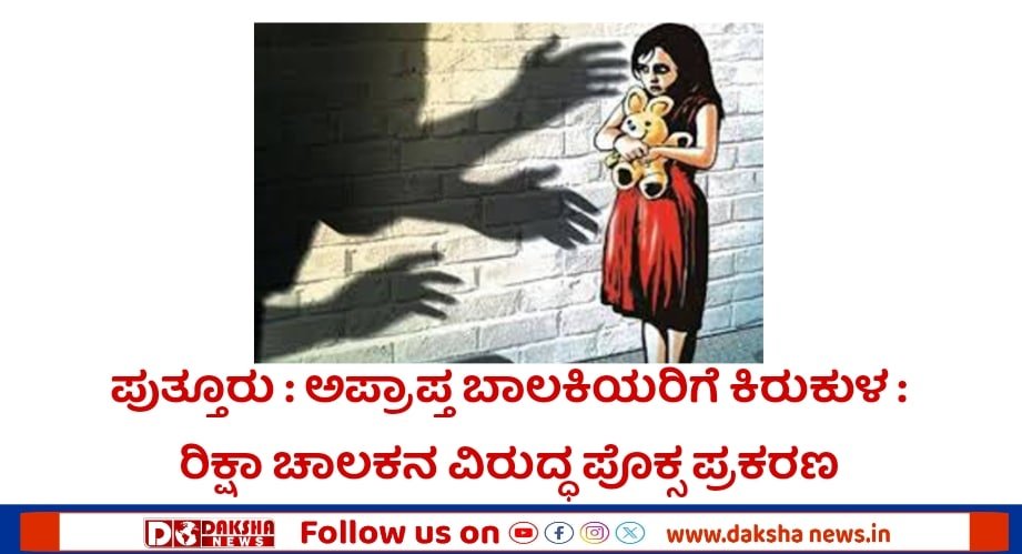 ಪುತ್ತೂರು: ಶಾಲೆಗೆ ಹೋಗುತ್ತಿದ್ದ ಬಾಲಕಿಗೆ ಕಿರುಕುಳ ನೀಡಿದ ಆರೋಪಿ ರಿಕ್ಷಾ ಚಾಲಕನ ವಿರುದ್ಧ ಪೊಲೀಸರು ಪೊಕ್ಸ ಪ್ರಕರಣ ದಾಖಲಿಸಿಕೊಂಡಿದ್ದಾರೆ. ಅಪ್ರಾಪ್ತ ಬಾಲಕಿಯರಿಬ್ಬರು ಕೆಲವು ದಿನಗಳ ಹಿಂದೆ ಶಾಲೆಗೆ ತೆರಳುತ್ತಿದ್ದಾಗ, ಒಬ್ಬ ಅಪರಿಚಿತ ವ್ಯಕ್ತಿ ಆಟೋ ರಿಕ್ಷಾದಲ್ಲಿ ಹಿಂಬಾಲಿಸಿ ಕಿರುಕುಳ ನೀಡಿದ್ದ. ನ.8ರಂದು ಬೆಳಿಗ್ಗೆ ಬಾಲಕಿಯರು ಶಾಲೆಗೆ ಹೋಗುತ್ತಿದ್ದಾಗ,ಅದೇ ಅಪರಿಚಿತ ವ್ಯಕ್ತಿಯು ಆಟೊ ರಿಕ್ಷಾದಲ್ಲಿ ಬಂದು ಕಿರುಕುಳ ನೀಡಿದ್ದ ಎಂದು ಆರೋಪಿಸಲಾಗಿದೆ. ಈ ಸಂಬಂಧ ಆರೋಪಿ ರಿಕ್ಷಾ ಚಾಲಕ ಪ್ರಸಾದ್ ಎಂಬಾತನ ವಿರುದ್ಧ ದ.ಕ ಮಹಿಳಾ ಪೊಲೀಸ್ ಠಾಣೆಯಲ್ಲಿ ಕಲಂ 78(2) BNS 2023 U/S:12 POCSO Act 2012 ಪ್ರಕರಣ ದಾಖಲಿಸಿಕೊಂಡು ತನಿಖೆ ನಡೆಸುತ್ತಿದ್ದಾರೆ.