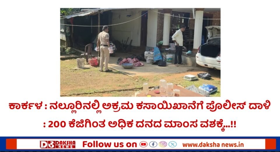 ಕಾರ್ಕಳ : ನಲ್ಲೂರು ಗ್ರಾಮದ ಕರ್ಮರಟ್ಟೆ ಪಡೀಲುಬೆಟ್ಟು ಎಂಬಲ್ಲಿ ಅಕ್ರಮ ಕಸಾಯಿಖಾನೆಗೆ ಪೊಲೀಸರು ದಾಳಿ ನಡೆಸಿ, 200 ಕೆಜಿ ಗಿಂತ ಅಧಿಕ ದನದ ಮಾಂಸವನ್ನು ವಸಪಡಿಸಿಕೊಂಡಿದ್ದಾರೆ.ದಾಳಿಯ ವೇಳೆ ಪ್ರಮುಖ ಆರೋಪಿ ಅಶ್ರಫ್ ಸೇರಿದಂತೆ ನವಾಜ್, ಅಫ್ತಾಬ್ (ಅಪ್ಪು) ಪರಾರಿಯಾಗಿದ್ದಾರೆ.ಅಶ್ರಫ್ ಪಡೀಲುಬೆಟ್ಟುವಿನ ತನ್ನ ಮನೆಯನ್ನೇ ಅಕ್ರಮ ಕಸಾಯಿಖಾನೆಯಾಗಿ ಮಾಡಿಕೊಂಡಿದ್ದು, ಹಲವು ಸಮಯದಿಂದ ದನಗಳನ್ನು ಕಡಿದು ಮಾಂಸ ಮಾಡಿ ಮಾರಾಟ ಮಾಡುವ ದಂಧೆ ನಡೆಸುತ್ತಿದ್ದ.ಈ ಬಗ್ಗೆ ಸ್ಥಳೀಯರು ನೀಡಿದ ಮಾಹಿತಿಯಂತೆ ಇಂದು (ನ.11) ಬೆಳಗ್ಗೆ ಕಾರ್ಕಳ ಗ್ರಾಮಾಂತರ ಠಾಣಾ ಪೊಲೀಸರು ದಾಳಿ ನಡೆಸಿದ್ದಾರೆ.
