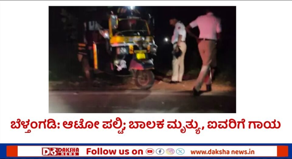 ಬೆಳ್ತಂಗಡಿ: ಬೆಳ್ತಂಗಡಿ ತಾಲೂಕಿನ ಲಾಯಿಲ ಗ್ರಾಮದ ಕುತ್ರೋಟ್ಟು-ಟಿ.ಬಿ.ಕ್ರಾಸ್ ರಸ್ತೆಯ ಹೊಕ್ಕಿಲ ಎಂಬಲ್ಲಿ ಚಾಲಕನ ನಿಯಂತ್ರಣ ತಪ್ಪಿ ಆಟೋ ಪಲ್ಟಿಯಾಗಿ ಓರ್ವ ಬಾಲಕ ಮೃತಪಟ್ಟಿದ್ದು, ಐವರು ಗಾಯಗೊಂಡಿರುವ ಘಟನೆ ಭಾನುವಾರ ರಾತ್ರಿ ನಡೆದಿದೆ.