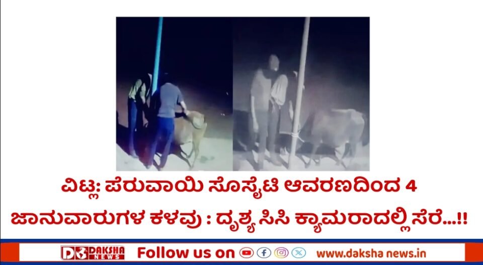 ವಿಟ್ಲ: ಬಂಟ್ವಾಳ ತಾಲೂಕು ಪೆರುವಾಯಿ ಗ್ರಾಮದ ಪೆರುವಾಯಿ ಸೊಸೈಟಿ ಆವರಣದಲ್ಲಿ ರಾತ್ರಿ ವೇಳೆ ಕಟ್ಟಿಹಾಕಿದ್ದ ನಾಲ್ಕು ದನಗಳನ್ನು ಮುಸುಕುಧಾರಿ ಕಳ್ಳರು ಕಳವು ಮಾಡಿರುವ ಘಟನೆ ಬಂಟ್ವಾಳ ತಾಲೂಕಿನ ಪೆರುವಾಯಿ ಗ್ರಾಮದಲ್ಲಿ ನಡೆದಿದೆ.