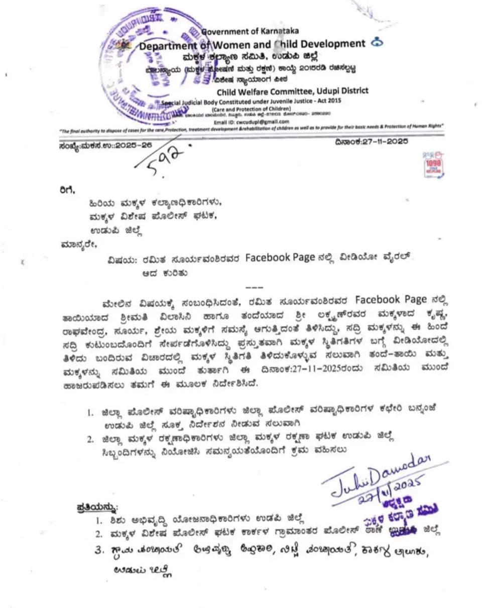 ಈ ಹಿಂದೆ ಲಕ್ಷ್ಮಣ್ ಅವರು ಮಕ್ಕಳಿಗೆ ಹೊಡೆದು ಕಿರುಕುಳ ನೀಡಿದ ಘಟನೆ ನಡೆದಿತ್ತು. ಬಳಿಕ ಮಕ್ಕಳನ್ನು ಮಕ್ಕಳ ವಿಶೇಷ ಕಲ್ಯಾಣ ಘಟಕದಲ್ಲಿ ಇಡಲಾಗಿತ್ತು. ಕೆಲ ಸಮಯಗಳ ಹಿಂದೆ ಮಕ್ಕಳು ಮರಳಿ ಮನೆ ಸೇರಿದ್ದರು. ಮಕ್ಕಳ ತಂದೆ ಲಕ್ಷಣ್ ಅವರು ಮತ್ತದೆ ವರ್ತನೆ ತೋರಿರುವುದು ರಮಿತಾ ಸೂರ್ಯವಂಶಿ ಅವರ ಗಮನಕ್ಕೆ ಬಂದಿತ್ತು.ಮನೆಯ ವಾಸ್ತವ ಸ್ಥಿತಿಯನ್ನು ಅವರು ಸಾಮಾಜಿಕ ಜಾಲತಾಣದಲ್ಲಿ ಹಂಚಿಕೊಂಡಿದ್ದರು. ಇದರಿಂದ ಎಚ್ಚೆತ್ತ ಮಕ್ಕಳ ಕಲ್ಯಾಣ ಸಮಿತಿಯು ಮಕ್ಕಳ ಪ್ರಸ್ತುತ ಸ್ಥಿತಿ–ಗತಿಗಳನ್ನು ಪರಿಶೀಲಿಸುವ ಅಗತ್ಯವನ್ನು ತುರ್ತು ಎಂದು ಪರಿಗಣಿಸಿದೆ.ಸಂಬಂಧಿತ ವಿಚಾರಣೆಗಾಗಿ ಮಕ್ಕಳ ಕಲ್ಯಾಣ ಸಮಿತಿಯ ಅಧ್ಯಕ್ಷೆ ಜೂಹಿ ದಾಮೋದರ್ ಅವರು, ಪೋಷಕರು ಹಾಗೂ ಮಕ್ಕಳು 27-11-2025ರಂದು ಸಮಿತಿಯ ಮುಂದೆ ಹಾಜರಾಗುವಂತೆ ನಿರ್ದೇಶನ ಹೊರಡಿಸಿದ್ದಾರೆ. ಜೊತೆಗೆ ಕೆಲ ಸೂಚನೆಗಳನ್ನು ನೀಡಿದ್ದಾರೆ.ಜಿಲ್ಲಾ ಪೊಲೀಸ್ ವರಿಷ್ಠಾಧಿಕಾರಿ, ಬನ್ನಂಜೆ, ಉಡುಪಿ ಇವರು ಪ್ರಕರಣಕ್ಕೆ ಸಂಬಂಧಿಸಿದಂತೆ ಸೂಕ್ತ ನಿರ್ದೇಶನ ನೀಡಿ ಸಹಕರಿಸಲು ವಿನಂತಿಸಲಾಗಿದೆ.. ಜಿಲ್ಲಾ ಮಕ್ಕಳ ರಕ್ಷಣಾಧಿಕಾರಿಗಳು, ಮಕ್ಕಳ ರಕ್ಷಣಾ ಘಟಕ – ಸಿಬ್ಬಂದಿಗಳನ್ನು ನಿಯೋಜಿಸಿ, ಸಮನ್ವಯತೆಯಿಂದ ಅಗತ್ಯ ಕ್ರಮ ಕೈಗೊಳ್ಳುವಂತೆ ಸೂಚಿಸಿದೆ.