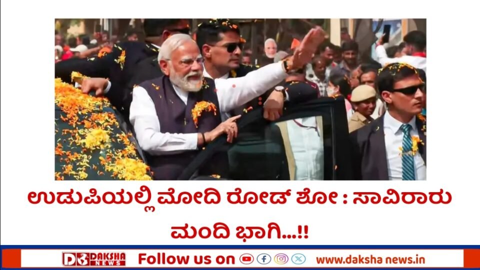 ಉಡುಪಿ: ಪ್ರಧಾನಿ ನರೇಂದ್ರ ಮೋದಿ ಸೇನಾ ಹೆಲಿಕಾಪ್ಟರ್ ನಲ್ಲಿ ಉಡುಪಿಗೆ ಆಗಮಿಸಿದ್ದು ಇದೀಗ ಉಡುಪಿಯ ಕರಾವಳಿ ಬೈಪಾಸ್ ನಿಂದ ಬನ್ನಂಜೆ ಮಾರ್ಗವಾಗಿ ಕಲ್ಸಂಕದವರೆಗೆ ನಡೆಯುತ್ತಿರುವ ರೋಡ್ ಶೋ ನಲ್ಲಿ ಭಾಗವಹಿಸಿದರು.